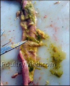 הערה: נתבקשתי לחלוק עם הרופאים הווטרינרים, ממצא המופיע במקרים ההיפר-חריפים המדווחים לאחרונה. קילוף קל המופיע בדופן המעי הדק, לא קטראלי. תמונה פתולוגית זו דווחה הן בעופות הרביה הכבדה במשק אורנים, בנימינה והן במשק תרנגולי ההודו באביאל (באדיבות, ד"ר יודק'ה פרידמן).