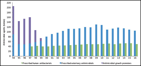 השימוש הכולל בתכשירים אנטי-מיקרוביאלים בבעלי חיים ירד בשנת 2016, זו השנה השלישית ברציפות, בכ -5% בהשוואה לשנת 2015. הירידה נבעה בעיקר מצמצום השימוש של תכשירים אלה בחזירים. לאחר שנתיים, בהן דווחה תחלואה גבוהה בענף העופות, חלה בשנת 2016 ירידה (למעט תרנגולי הודו) חדה בשימוש בתכשירים אנטי-מיקרוביאלים והיקף השימוש חזר לרמות טרם עלתה התחלואה.