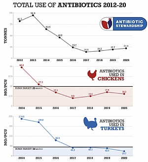 דו"ח המועצה הבריטית לענף העופות מדווח על שימוש של 21 טון תכשירים אנטי-מיקרוביאלים במהלך שנת 2020, לעומת 81.7 טון בשנת 2012.