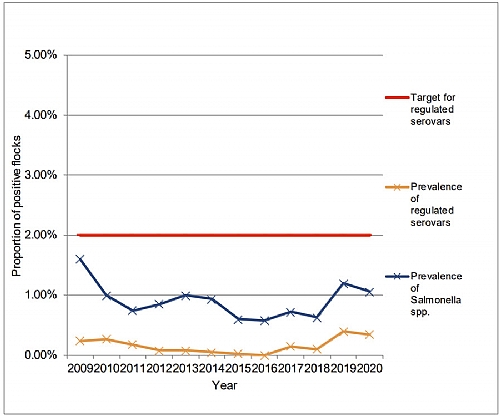 שכיחות סלמונלה בשלוחת ההטלה בבריטניה 2009-2020 (תכנית ניטור לאומית)