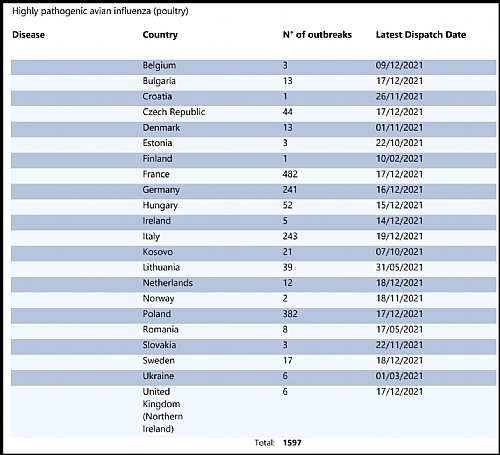 לשם השוואה, בשנת 2020 דווחו 442 התפרצויות של שפעת עופות (HPAI), מ-16 מדינות. המדינה המובילה בשנת 2021 במספר האירועים היא צרפת עם 482 התפרצויות, רובן במחצית הראשונה של השנה.