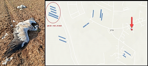 ד"ר רם כץ, רופא ראשי לבריאות העופות, מדווח על איתור פגרי עגורים בשדות בקרבת מוקד שפעת העופות ברם-און. תמונה שצולמה על ידו מצורפת מטה.