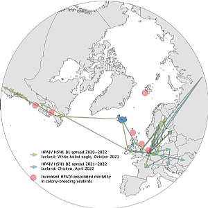 התפשטות הנגיף HPAIV H5N1 בין מושבות של מינים שונים של צפורי בר באיסלנד. התוצאות ההרסניות של התפשטות הנגיף האלים בקרב מושבות של ציפורי בר נצפו במספר אתרי רבייה בצפון האוקיינוס האטלנטי.