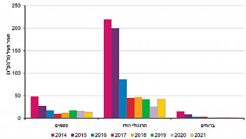 בשלוחת הברווזים לבשר, שנת 2021 הציגה ירידה של 0.9 מ"ג/ק"ג (1.7 מ"ג/ק"ג) בהשוואה לשנה קודמת וירידה של 89% (13.4 מ"ג/ק"ג) מאז 2014.