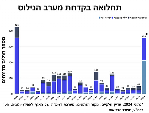 נמשכת תחלואה חריגה בישראל, בעיקר באזור המרכז – החל מחודש מאי מדווח על צבר מקרי תחלואה בישראל. נכון ל- 11/07/24, דווחו 356 חולים ו- 19 נפטרים. מרבית החולים שדווחו הם ממרכז הארץ, אך תחלואה מדווחת, מעט, גם באזורים נוספים. מרבית החולים הינם קשישים (בעיקר מעל גיל 70), גברים יותר מנשים, אך מוכרים מקרים גם בילדים. במסגרת אירועים אילו מדווח אירוע חריג של פגיעה עינית (Choroiditis - דלקת בדמית העין) בבת 30 כתוצאה מפגיעת הנגיף.