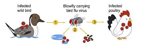 מחקר חדש שנערך במושבה של ציפורי בר בדרום יפן מגלה כי זבובים הם אמצעי פוטנציאלי להעברת נגיף שפעת העופות. חוקרים מאוניברסיטת Kyushu ביפן, גילו כי זבובים, ממין הנמשך מאד לבשר וצואה נושאים את נגיף שפעת העופות בדרום יפן. המחקר מפרסם בכתב העת המדעי Scientific Reports, מציג נתיב פוטנציאלי חדש להפצת נגיף שפעת העופות ומחייב התייחסות מקצועית נדרשת בשיטות המניעה והבקרה בהתמודדות עם המחלה.קבוצת החוקרים היפנים, חקרה מושב של עגורים בעיר Izumi, מחוז Kagoshima, בדרום יפן. בחורף, העונה העיקרית של שפעת העופות, אלפי עגורים נודדים לאזור זה, כאשר הצפיפות הגבוהה של אוכלוסיית העגורים הופכת אותם פגיעים לנגיף. במהלך חורף 2022-2023, 1600 עגורים מתוך מושבה של 10,000 פרטים מתו משפעת העופות. החוקרים הציבו מלכודות במקומות שונים בעיר Izumi כדי לאסוף זבובים. החוקרים התעניינו במיוחד במין מסויים של זבובים Calliphora nigribarbis, שכן בניגוד למיני זבובים אחרים, הם פעילים בחורף ונמשכים לצואה ובשר. החוקרים אספו 648 זבובים וגילו ב-14 מתוכן את נגיף שפעת העופות. רוב הזבובים החיוביים לנגיף נאספו מאתר הדגימה הקרוב ביותר למושבת העגורים. ריצוף נגיף שפעת העופות מהזבובים תאם את נגיף השפעת שבודד מהעגורים. להבדיל מעופות ויונקים בהם הנגיף מתרבה, הזבובים בולעים את הנגיף מעופות מתים או מלשלשת נגועה, כאשר הנגיף נותר מדבק משך יומיים. זבובים אלה מסוגלים לעוף מרחק של לפחות 2 ק"מ ביום, כך שזבובים אלה יכולים פוטנציאלית להפיץ את הנגיף לחוות מרוחקות, לזהם משטחים, מקורות מזון ומקווי מים. ציפורים יכולות להידבק באמצעות מגע ישיר עם מקורות מזוהמים או ע"י בליעת זבובים בוגרים או זחלים.